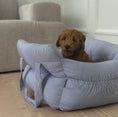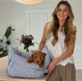 Hjalmar hundebilsæde er en kombineret taske og bilsæde, der sikrer din hund en tryg og komfortabel biltur. Den blå stribede version er på lager, mens farverne støvet grøn, sand og lys brun kan forudbestilles.