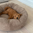 Elva kurv i lys brun bred fløjl fra By Doodle Dog tilbyder din hund en behagelig og stilfuld hvileplads med sin cirkulære form og hævede kanter, der kombinerer komfort med praktisk design.