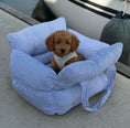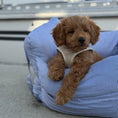 Hjalmar hundebilsæde er en kombineret taske og bilsæde, der sikrer din hund en tryg og komfortabel biltur. Den blå stribede version er på lager, mens farverne støvet grøn, sand og lys brun kan forudbestilles.